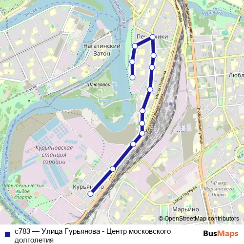 The first stop of the с783 bus route is Улица Гурьянова and the last stop is Центр московского долголетия. с783 (Улица Гурьянова - Центр московского долголетия) is operational during ежедневно.