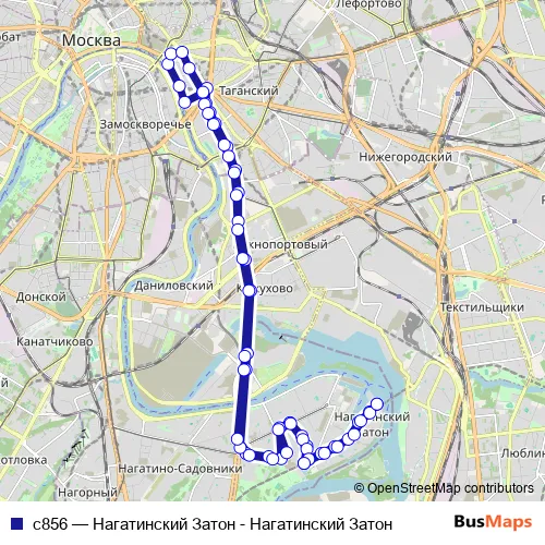 The first stop of the с856 bus route is Нагатинский Затон and the last stop is Нагатинский Затон. с856 (Нагатинский Затон - Нагатинский Затон) is operational during ежедневно.