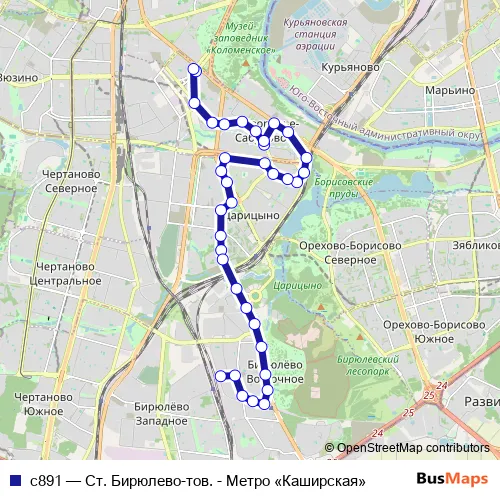The first stop of the с891 bus route is Метро «Каширская» and the last stop is Ст. Бирюлево-тов.. с891 (Ст. Бирюлево-тов. - Метро «Каширская») is operational during по будням.