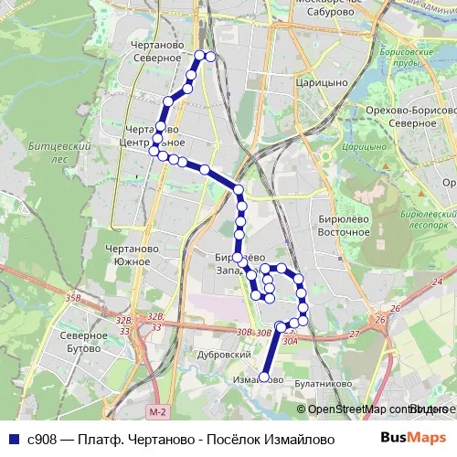 The first stop of the с908 bus route is Посёлок Измайлово and the last stop is Платф. Чертаново. с908 (Платф. Чертаново - Посёлок Измайлово) is operational during ежедневно.