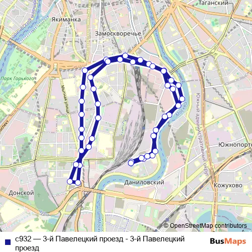 The first stop of the с932 bus route is 3-й Павелецкий проезд and the last stop is 3-й Павелецкий проезд. с932 (3-й Павелецкий проезд - 3-й Павелецкий проезд) is operational during ежедневно.