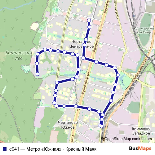 The first stop of the с941 bus route is Метро «Южная» and the last stop is Красный Маяк. с941 (Метро «Южная» - Красный Маяк) is operational during ежедневно.