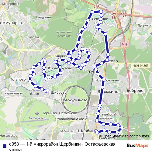 The first stop of the с953 bus route is 1-й микрорайон Щербинки and the last stop is Остафьевская улица. с953 (1-й микрорайон Щербинки - Остафьевская улица) is operational during ежедневно.