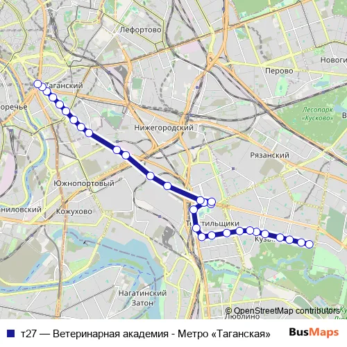 The first stop of the т27 bus route is Ветеринарная академия and the last stop is Метро «Таганская». т27 (Ветеринарная академия - Метро «Таганская») is operational during ежедневно.