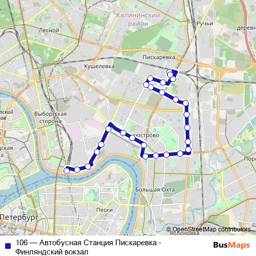 The first stop of the 106 bus route is Финляндский вокзал and the last stop is а.с. Пискарёвка, Посадки И Высадки Нет. 106 (Автобусная Станция Пискаревка - Финляндский вокзал) is operational during ежедневно.