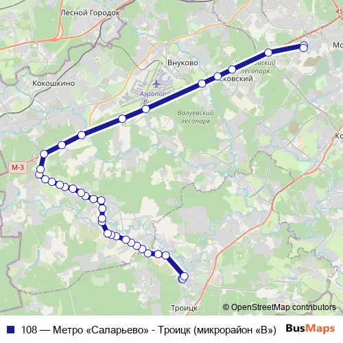 The first stop of the 108 bus route is Троицк (микрорайон «В») and the last stop is Метро «Саларьево». 108 (Метро «Саларьево» - Троицк (микрорайон «В»)) is operational during ежедневно.