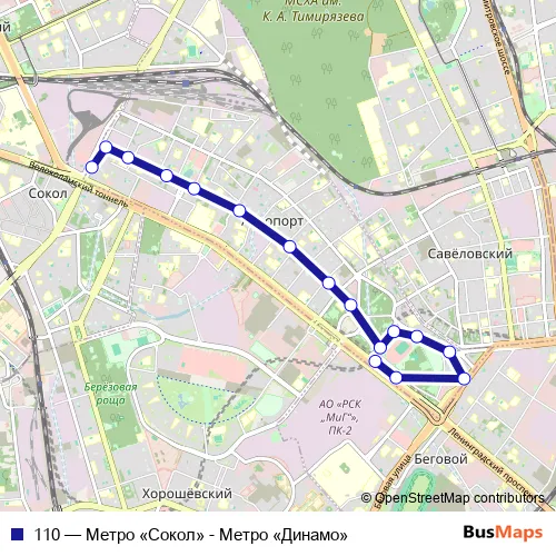 The first stop of the 110 bus route is Метро «Сокол» and the last stop is Метро «Динамо». 110 (Метро «Сокол» - Метро «Динамо») is operational during ежедневно.