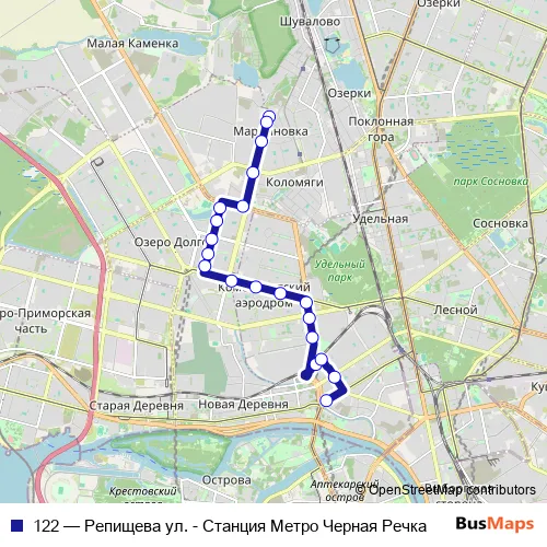 The first stop of the 122 bus route is а.с. Репищева ул., Посадки И Высадки Нет and the last stop is наб. Чёрной Речки. 122 (Репищева ул. - Станция Метро Черная Речка) is operational during ежедневно.