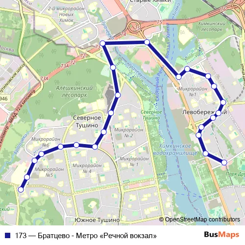 The first stop of the 173 bus route is Метро «Речной вокзал» and the last stop is Братцево. 173 (Братцево - Метро «Речной вокзал») is operational during ежедневно.