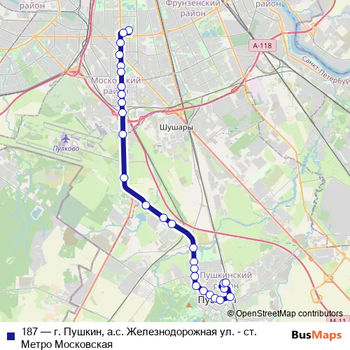 Click here to view the nearest 187 - г. Пушкин, а.с. Железнодорожная ул. - ст. Метро Московская bus stop.