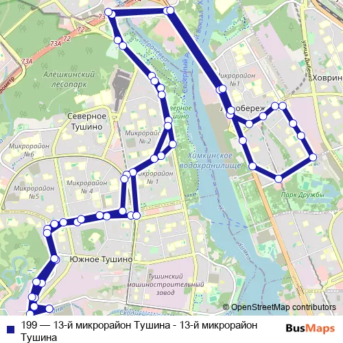 The first stop of the 199 bus route is 13-й микрорайон Тушина and the last stop is 13-й микрорайон Тушина. 199 (13-й микрорайон Тушина - 13-й микрорайон Тушина) is operational during по выходным.