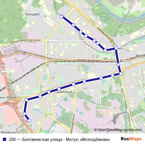 Click here to view the nearest 200 - Беловежская улица - Метро «Молодёжная» bus stop.