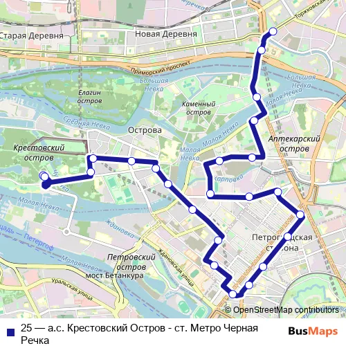 The first stop of the 25 bus route is а.с. Крестовский Остров - Посадки/Высадки Нет and the last stop is ст. Метро Чёрная Речка. 25 (а.с. Крестовский Остров - ст. Метро Черная Речка) is operational during ежедневно.