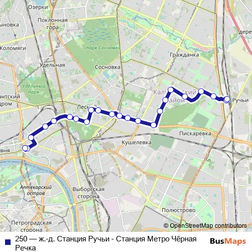 The first stop of the 250 bus route is а.с. Ручьи Посадки И Высадки Нет and the last stop is ст. Метро Чёрная Речка. 250 (ж.-д. Станция Ручьи - Станция Метро Чёрная Речка) is operational during ежедневно.