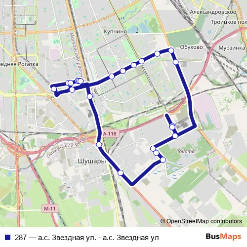 The first stop of the 287 bus route is а.с. Звёздная ул., Посадки И Высадки Нет and the last stop is а.с. Звёздная ул., Посадки И Высадки Нет. 287 (а.с. Звездная ул. - а.с. Звездная ул) is operational during ежедневно.