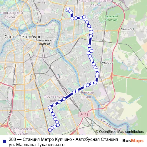 Bus 288 - Станция Метро Купчино - Автобусная Станция ул. Маршала Тухачевского Schedule in Saint Petersburg