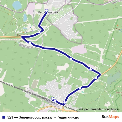 The first stop of the 321 bus route is Решетниково and the last stop is Зеленогорск, вокзал, Посадки И Высадки Нет. 321 (Зеленогорск, вокзал - Решетниково) is operational during ежедневно.