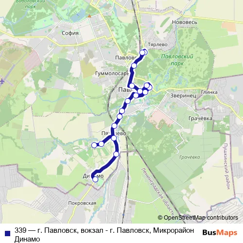 The first stop of the 339 bus route is пос. Динамо and the last stop is а.с. Павловск, Посадки И Высадки Нет. 339 (г. Павловск, вокзал - г. Павловск, Микрорайон Динамо) is operational during ежедневно.