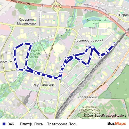 The first stop of the 346 bus route is Платф. Лось and the last stop is Платформа Лось. 346 (Платф. Лось - Платформа Лось) is operational during ежедневно.