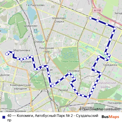 Click here to view the nearest 40 - Коломяги, Автобусный Парк № 2 - Суздальский пр bus stop.