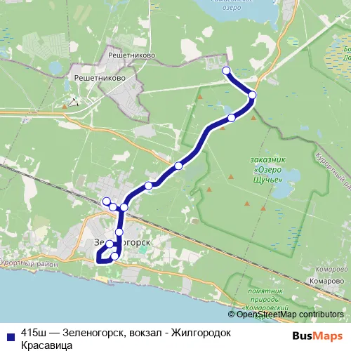 The first stop of the 415ш bus route is Зеленогорск, вокзал, Посадки И Высадки Нет and the last stop is Жилгородок Красавица. 415ш (Зеленогорск, вокзал - Жилгородок Красавица) is operational during ежедневно.