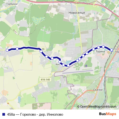 The first stop of the 458а bus route is Иннолово, Весовая пл. and the last stop is ж.-д. ст. Горелово. 458а (Горелово - дер. Иннолово) is operational during ежедневно.