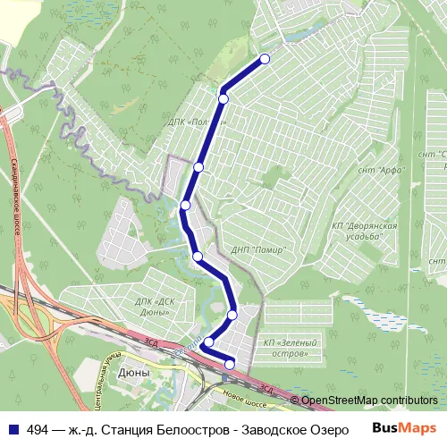 The first stop of the 494 bus route is ж.-д. Станция Белоостров and the last stop is Заводское Озеро. 494 (ж.-д. Станция Белоостров - Заводское Озеро) is operational during ежедневно.
