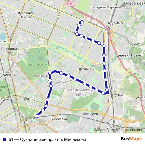 The first stop of the 51 tram route is Конечная Станция Суздальский пр. and the last stop is ж.-д. Станция Кушелевка (Оборотная, Посадки/Высадки Нет). 51 (Суздальский пр. - пр. Мечникова) is operational during ежедневно.