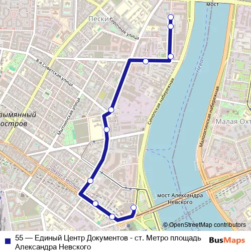The first stop of the 55 bus route is Амбарная ул. and the last stop is Единый Центр Документов - Посадки И Высадки Нет. 55 (Единый Центр Документов - ст. Метро площадь Александра Невского) is operational during ежедневно.