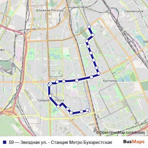 The first stop of the 59 bus route is а.с. Звёздная ул., Посадки И Высадки Нет and the last stop is ст. Метро Бухарестская. 59 (Звездная ул. - Станция Метро Бухарестская) is operational during ежедневно.