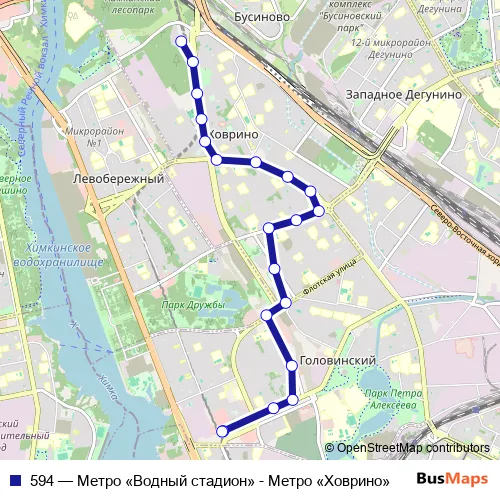 The first stop of the 594 bus route is Метро «Ховрино» and the last stop is Метро «Водный стадион». 594 (Метро «Водный стадион» - Метро «Ховрино») is operational during ежедневно.