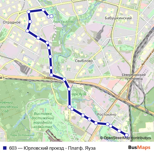 The first stop of the 603 bus route is Платф. Яуза and the last stop is Юрловский проезд. 603 (Юрловский проезд - Платф. Яуза) is operational during ежедневно.