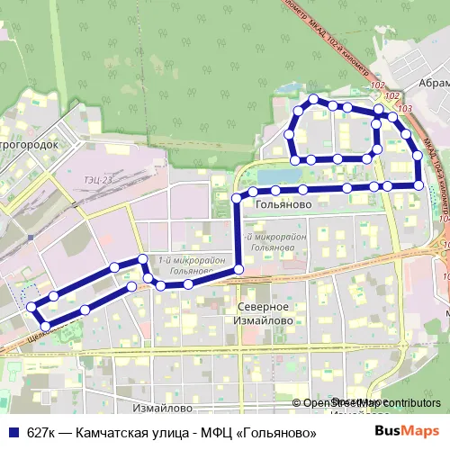 The first stop of the 627к bus route is МФЦ «Гольяново» and the last stop is Камчатская улица. 627к (Камчатская улица - МФЦ «Гольяново») is operational during ежедневно.