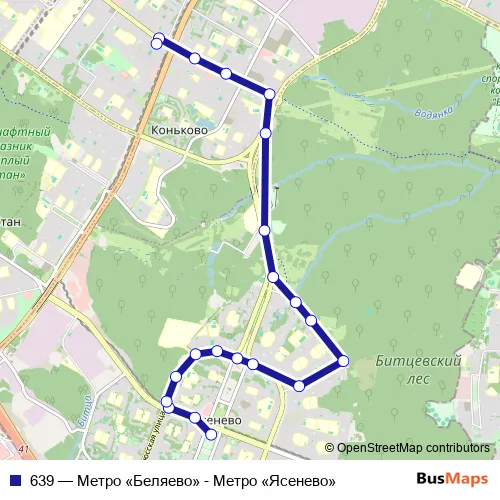 The first stop of the 639 bus route is Метро «Ясенево» and the last stop is Метро «Беляево». 639 (Метро «Беляево» - Метро «Ясенево») is operational during ежедневно.