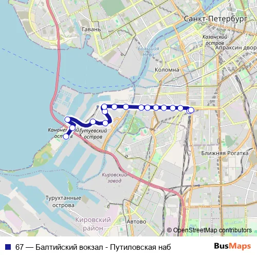 The first stop of the 67 bus route is Канонерский Остров, д.11 and the last stop is Балтийский вокзал. 67 (Балтийский вокзал - Путиловская наб) is operational during ежедневно.