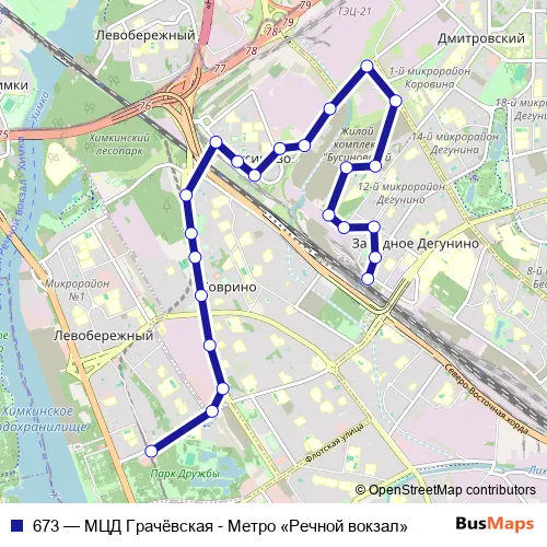 The first stop of the 673 bus route is Метро «Речной вокзал» and the last stop is МЦД Грачёвская. 673 (МЦД Грачёвская - Метро «Речной вокзал») is operational during ежедневно.