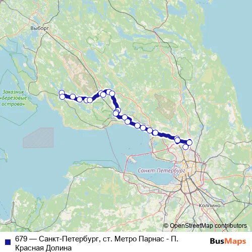 The first stop of the 679 bus route is Красная Долина and the last stop is ст. Метро Парнас. 679 (Санкт-Петербург, ст. Метро Парнас - П. Красная Долина) is operational during ежедневно.