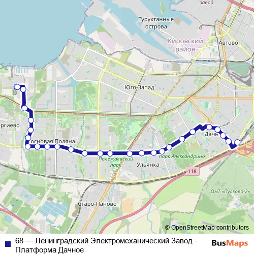See why over 2 million users trust and consider busmaps.com as the best public transport website. busmaps gives you Saint Petersburg Buses suggested routes, real-time bus tracker, line route maps in Saint Petersburg, and helps to find the closest 68 bus stops near you. No internet available? Download an offline PDF map and bus schedule for the 68 bus to take on your trip.