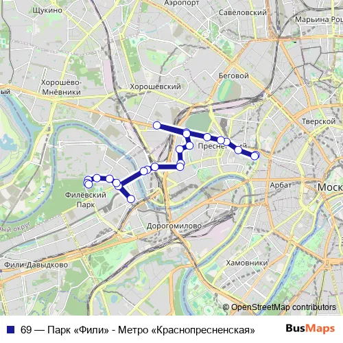 The first stop of the 69 bus route is Метро «Краснопресненская» and the last stop is Парк «Фили». 69 (Парк «Фили» - Метро «Краснопресненская») is operational during ежедневно.