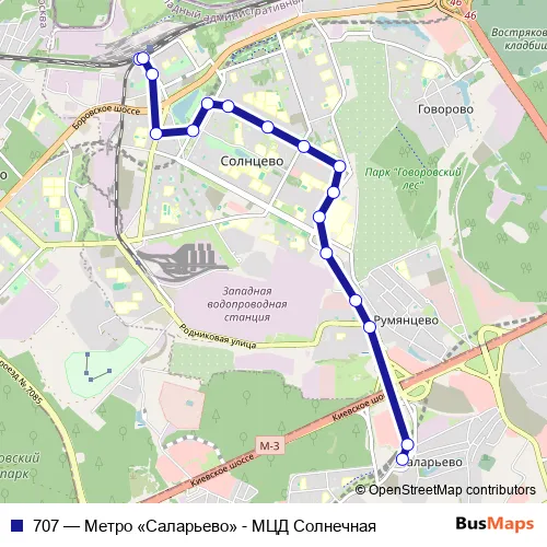 The first stop of the 707 bus route is МЦД Солнечная and the last stop is Метро «Саларьево». 707 (Метро «Саларьево» - МЦД Солнечная) is operational during ежедневно.