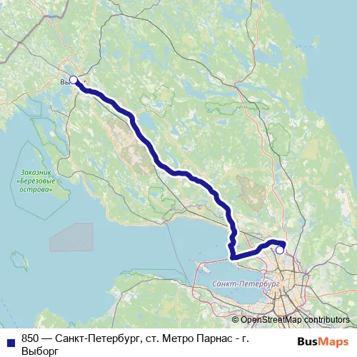 The first stop of the 850 bus route is Выборг and the last stop is ст. Метро Парнас. 850 (Санкт-Петербург, ст. Метро Парнас - г. Выборг) is operational during ежедневно.