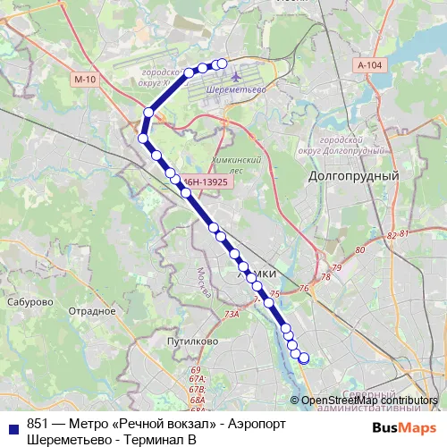 The first stop of the 851 bus route is Метро «Речной вокзал» and the last stop is Аэропорт Шереметьево - Терминал B. 851 (Метро «Речной вокзал» - Аэропорт Шереметьево - Терминал B) is operational during ежедневно.