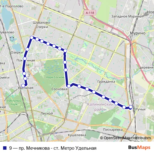 The first stop of the 9 tram route is ст. Метро Удельная and the last stop is Конечная Станция ж.-д. Станция Ручьи. 9 (пр. Мечникова - ст. Метро Удельная) is operational during ежедневно.