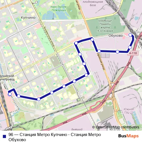 The first stop of the 96 bus route is Балканская пл., Посадки И Высадки Нет and the last stop is ж.-д. Станция Обухово. 96 (Станция Метро Купчино - Станция Метро Обухово) is operational during ежедневно.