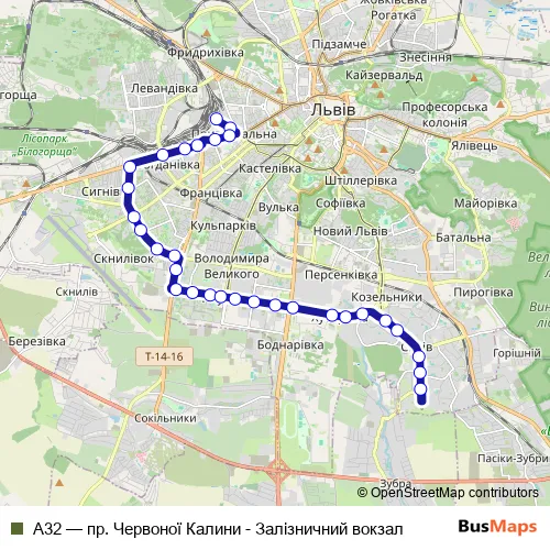 See why over 2 million users trust and consider busmaps.com as the best public transport website. busmaps gives you Lviv Buses suggested routes, real-time bus tracker, line route maps in Lviv, and helps to find the closest А32 bus stops near you. No internet available? Download an offline PDF map and bus schedule for the А32 bus to take on your trip.