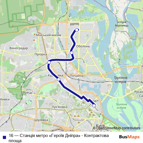 The first stop of the 16 tram route is Контрактова пл. and the last stop is ст.м.Героїв Дніпра. 16 (Станція метро «Героїв Дніпра» - Контрактова площа) is operational during ежедневно.