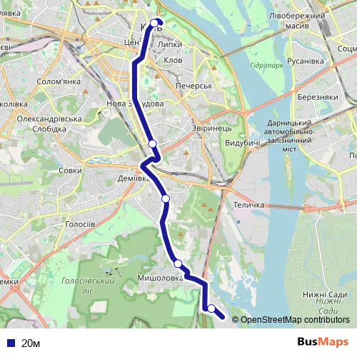 See why over 2 million users trust and consider busmaps.com as the best public transport website. busmaps gives you Kyiv Buses suggested routes, real-time bus tracker, line route maps in Kyiv, and helps to find the closest 20м bus stops near you. No internet available? Download an offline PDF map and bus schedule for the 20м bus to take on your trip.
