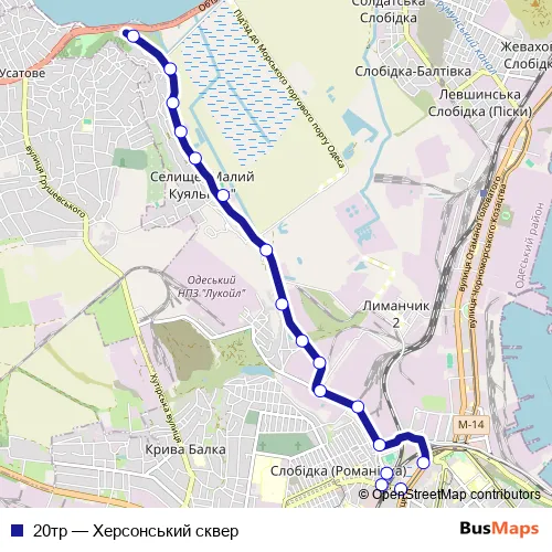 See why over 2 million users trust and consider busmaps.com as the best public transport website. busmaps gives you Odesa Buses suggested routes, real-time bus tracker, line route maps in Odesa, and helps to find the closest 20тр bus stops near you. No internet available? Download an offline PDF map and bus schedule for the 20тр bus to take on your trip.