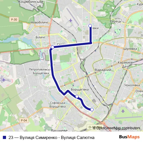 The first stop of the 23 bus route is Мих. Борщагівка and the last stop is Ринок. 23 (Вулиця Симиренко - Вулиця Салютна) is operational during ежедневно.