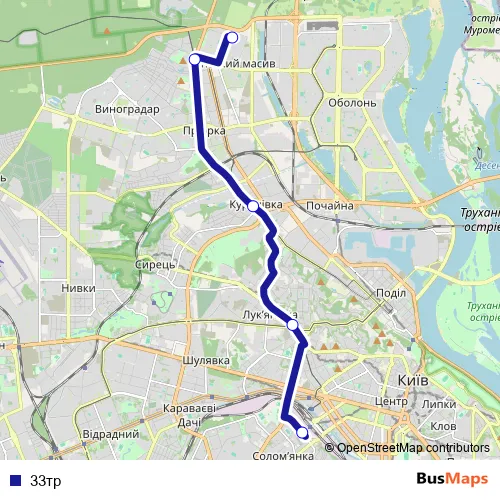 See why over 2 million users trust and consider busmaps.com as the best public transport website. busmaps gives you Kyiv Buses suggested routes, real-time bus tracker, line route maps in Kyiv, and helps to find the closest 33тр bus stops near you. No internet available? Download an offline PDF map and bus schedule for the 33тр bus to take on your trip.